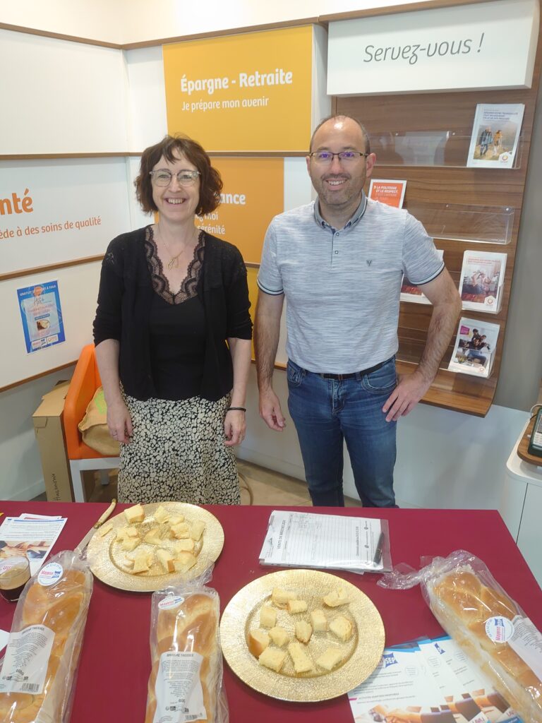 Vente de brioches chez notre partenaire Harmonie Mutuelle à Laval. A gauche, notre secrétaire Christelle Foulon. A droite, Jean François Gérard, Responsable Harmonie Mutuelle Mayenne Sarthe.